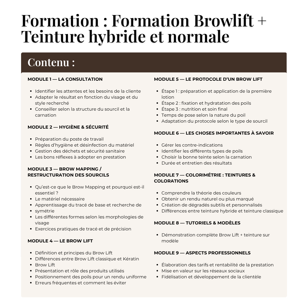 Cette formation complète vous enseigne le Brow Lift associé à la teinture classique et hybride pour obtenir des sourcils disciplinés, fournis et parfaitement définis.