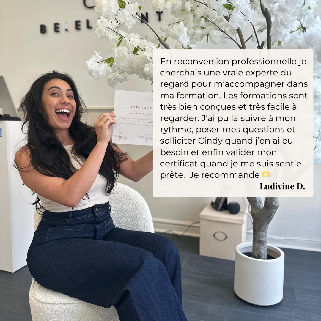 J’ai choisi Be Elegant pour me perfectionner avant d’ouvrir mon salon. Les modules sont précis, les démonstrations très pro, et le suivi de Cindy fait vraiment la différence. On se sent soutenue du début à la fin.