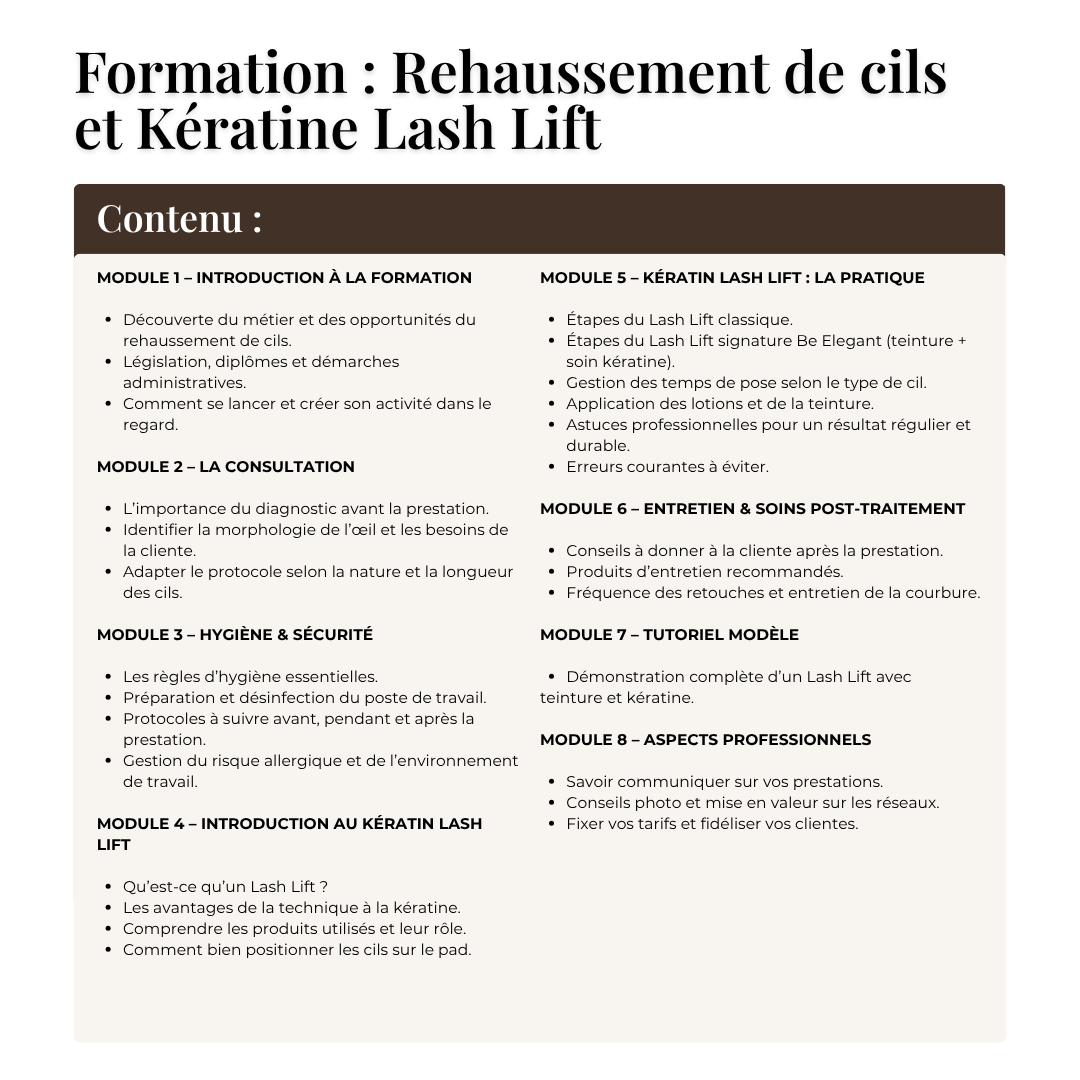 Vous découvrirez toutes les étapes essentielles : anatomie du cil, préparation, choix des pads, application, temps de pause, kératine, teinture et conseils post-soin.